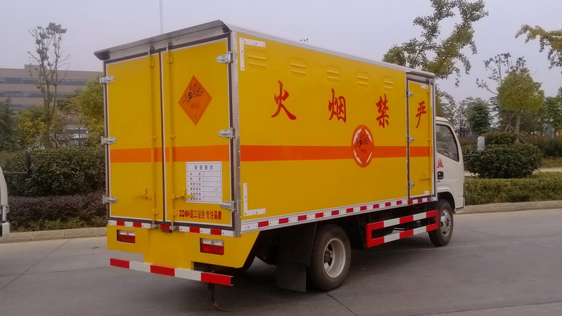 隨底盤選裝前面罩以及前霧燈,選裝右側(cè)箱體不開門,廂體頂部封閉,不可開啟:運(yùn)輸品名:黑火藥,炸藥,電引爆雷管,爆破炸藥,煙花爆竹等,類項(xiàng)號(hào):1.1B,1.1D,1.1G,1.2G,1.3G,1.4G 等; 防護(hù)材料:Q235A碳鋼,連接方式:左右側(cè)面及后下部防護(hù)均采用焊接連接,后部防護(hù)斷面尺寸(mm):100?0,后部防護(hù)離地高度(mm):450,采用發(fā)動(dòng)機(jī)型號(hào)CY4BK551,YC4FA115-50,D28D11-5DA,對(duì)應(yīng)油耗值分別為12.4;12.6;12.6。該車安裝帶有衛(wèi)星定位功能的行駛記錄儀。僅采用前盤制動(dòng)器和安裝ABS以及前置消聲器的底盤。采用子午線輪胎。安裝限速裝置,限速80km/h。ABS廠家及型號(hào):襄陽(yáng)東風(fēng)隆誠(chéng)機(jī)械有限責(zé)任公司/ABS/ASR-24V-4S/4M。